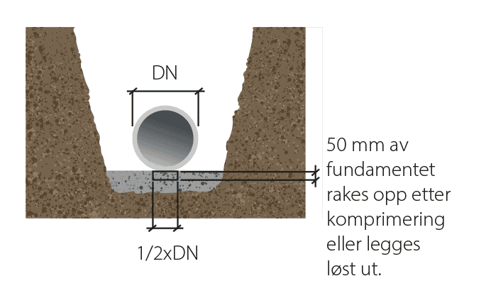 Fundamentet er den viktigste delen av grøftetverrsnittet. Det skal fordele oppleggstrykket under røret og sikre at ikke store steiner eller liknende ligger inntil røret.